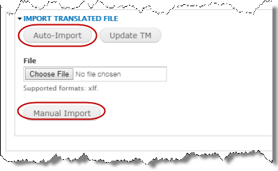 - In the Manual Import sub-section, click Choose File, then browse to the file to import to Drupal TMGMT, and then click Manual Import.
